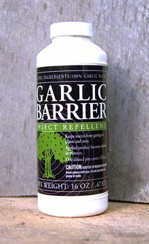 Garlic has been used since ancient times to repel insect pests. Garlic Barrier contains only garlic oil and water. It offers farmers and gardeners an easy-to-use alternative to chemical insecticides. Spray plants early in the season before insects have arrived because product will not disperse existing infestations. Four to eight applications per year can be made at ten day intervals. Pints and quarts are a weaker concentration than gallons. Mix pints and quarts using 1 part Garlic Barrier to 10 parts water. Mix gallons using 1 part Garlic Barrier to 100 parts water. Also effective at repelling mosquitoes. Mix as above and spray yard, trees, shrubs and brush around your home. Mosquitoes are repelled for up to 3 months. Sound too good to be true? There's lots of research and trial information to prove Garlic Barrier's success. See our website for information.